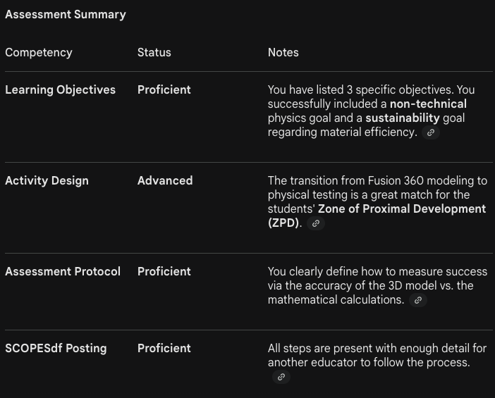 If a student is stuck starting, prod them with questions such as “what is the most important thing you will need to know in order to build this? how can you find that?”. Make sure they have access to the slides and can go back to the derivation and equation if necessary. Allow them to learn the intricacies of the CAD software on their own, but feel free to respond to specific questions that may arise about the program.