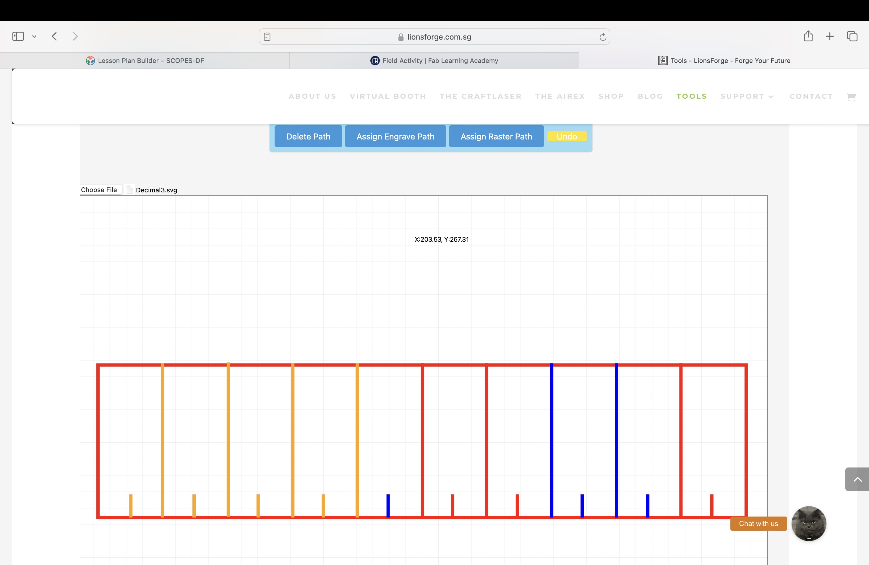 I had used a Lionforge laser cutter to cut the number bar. This was challenging as I had to generate the code online and download the code and send to the cutter. At the website, I needed to manually assign the engrave path (those lines that turned orange). Maybe there is a way, hopefully. I will try to find out later if there is one.
