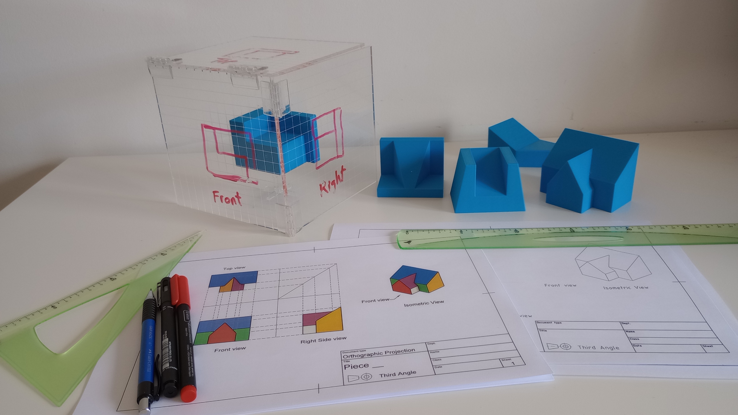 Students learn to draw orthographic projections using the three principal views of an object (front, top and right side view). We use the glass-box concept to show how views are projected onto the planes and then unfolded to present them on a 2D sheet. Working in groups, students receive a set of 3D-printed parts and worksheets to practice third-angle projections and isometric views.