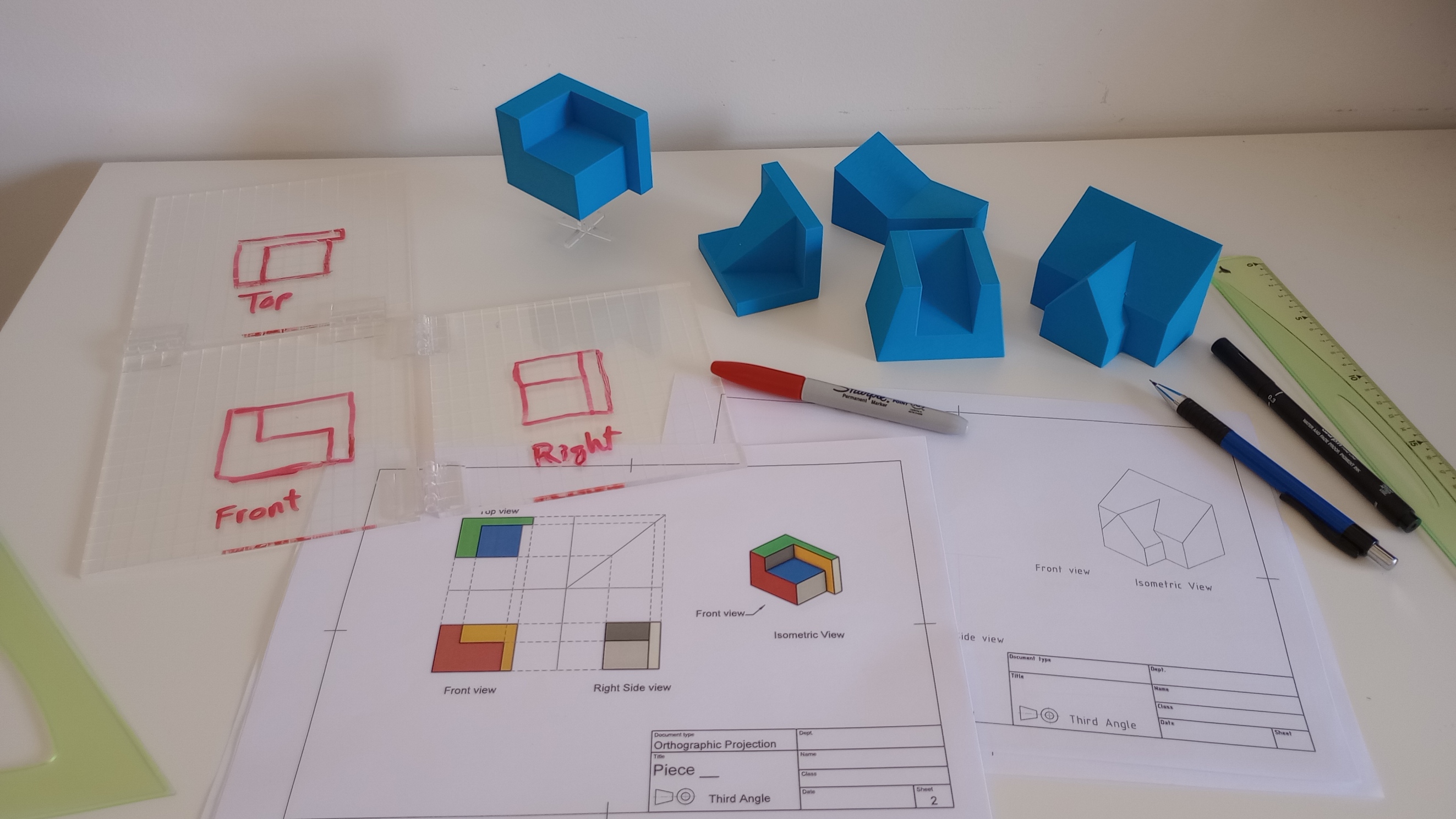• Students use the remaining 3D printed pieces to draw their orthographic projections (3rd angle projections) on the worksheets