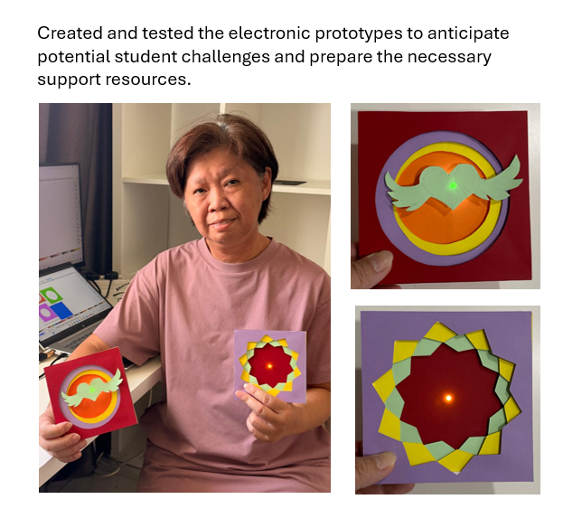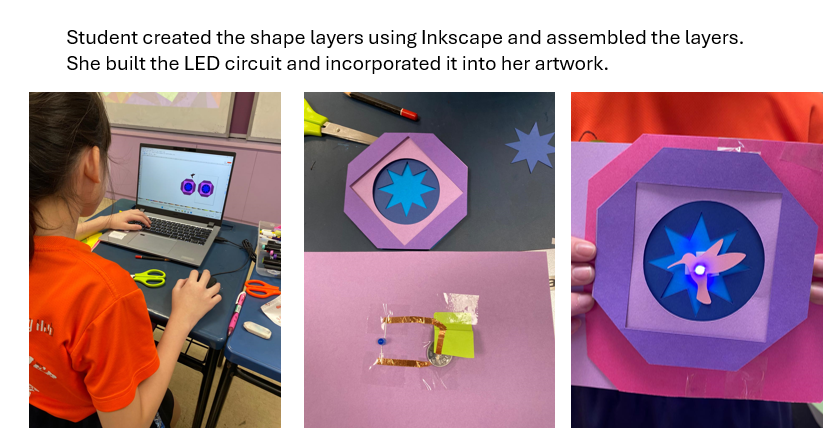 Many Primary 4 and 5 students can independently create simple shapes and follow step-by-step instructions, but tasks such as planning multi-layer compositions, using digital tools like Inkscape, or troubleshooting electrical circuits fall just beyond their independent capability. So, I intentionally structured the lesson with gradual scaffolding: beginning with a concrete hands-on paper layering activity before introducing digital layering, modelling each Inkscape tool slowly, and providing guided examples before students attempted their own designs. This allowed students to build confidence with familiar tasks before moving to more abstract or technical processes.