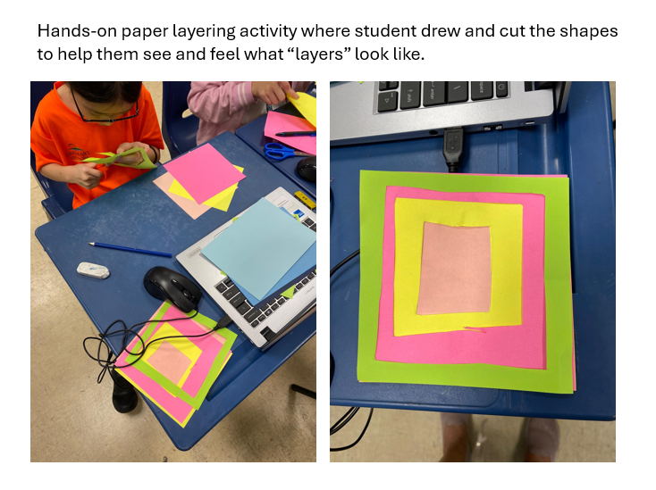 To support students with different learning needs, I built several scaffolds into the lesson. I started with a hands-on paper layering activity so that students who find abstract ideas difficult could first see and feel what “layers” look like before moving to digital work. I also showed sample designs, demonstrated each Inkscape tool step-by-step, and gave clear rules for the task (use geometric shapes and 3–5 layers). These supports helped students know exactly what to focus on.