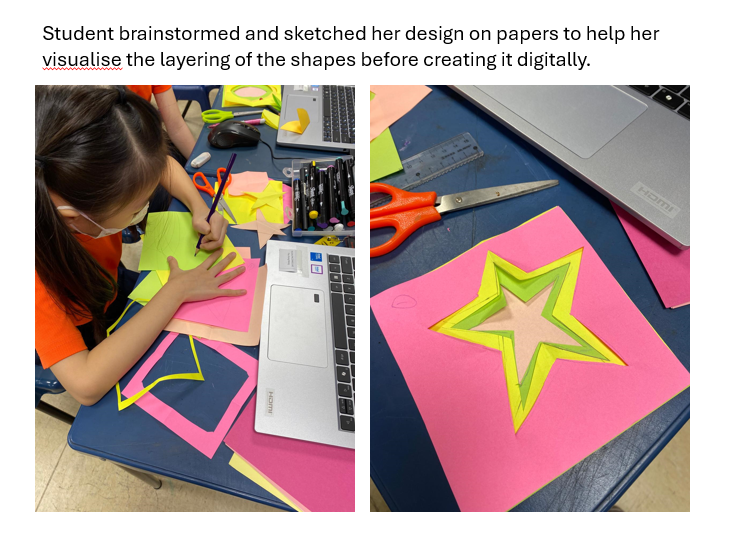 2.    Students brainstorm and sketch 2–3 layout ideas. Then choose 1 final design. They can use origami papers (just like they have practiced earlier to help them visualise the layering of their shapes before creating it digitally).