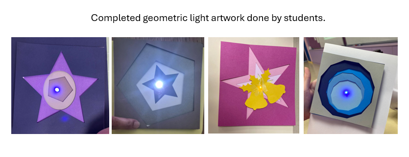 The activity aligned strongly with both the Art and Science curricula for Primary 4 and 5. Students were able to explore key Art concepts such as geometric shapes, symmetry, repetition, colour contrast, and layering, which directly support the P4 Art standards on understanding visual elements and using them purposefully in composition. At the same time, the integration of the LED circuit allowed students to apply Science learning from the P4 Light topic and the P5 Electrical System topic, particularly in recognising that light travels in straight lines, understanding how shadows form from cut-outs, and constructing a simple closed circuit using a battery, copper tape, and LED. The digital fabrication component also supported ICT and design-based competencies, aligning with 21CC outcomes such as problem-solving, planning, and resilience.