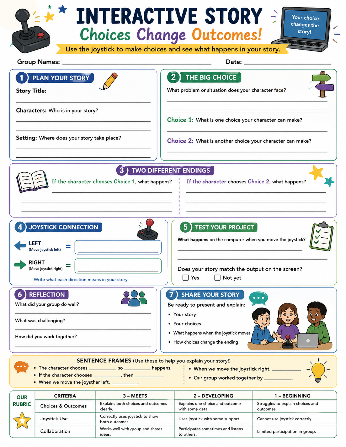 Each group presents their story to the class and demonstrates how moving the joystick changes the outcome. Students explain what each direction represents and how it affects the story. The teacher prompts students to describe how choices influence what happens next. Students reflect on how the technology helped make their story interactive. The class discusses how different choices lead to different results.