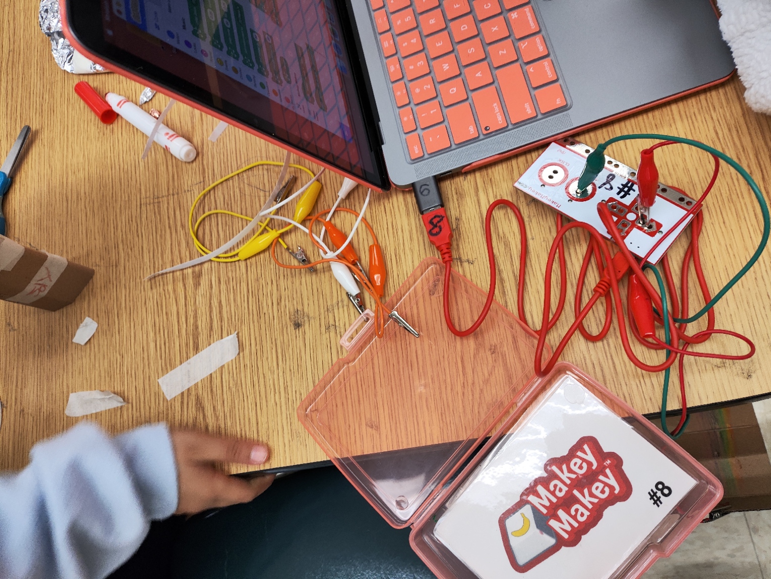 Have the students look for examples of musical instruments and analyze how different instruments have different designs to be able to create different kinds of sounds and music. Have them choose one instrument and let them create them with the craft materials, aluminum and brass fasteners. After that, instruct them to connect the instrument to the earth and inputs of a Makey Makey. Be sure to remind them to have an “earth button” which needs to be touched so the others work.