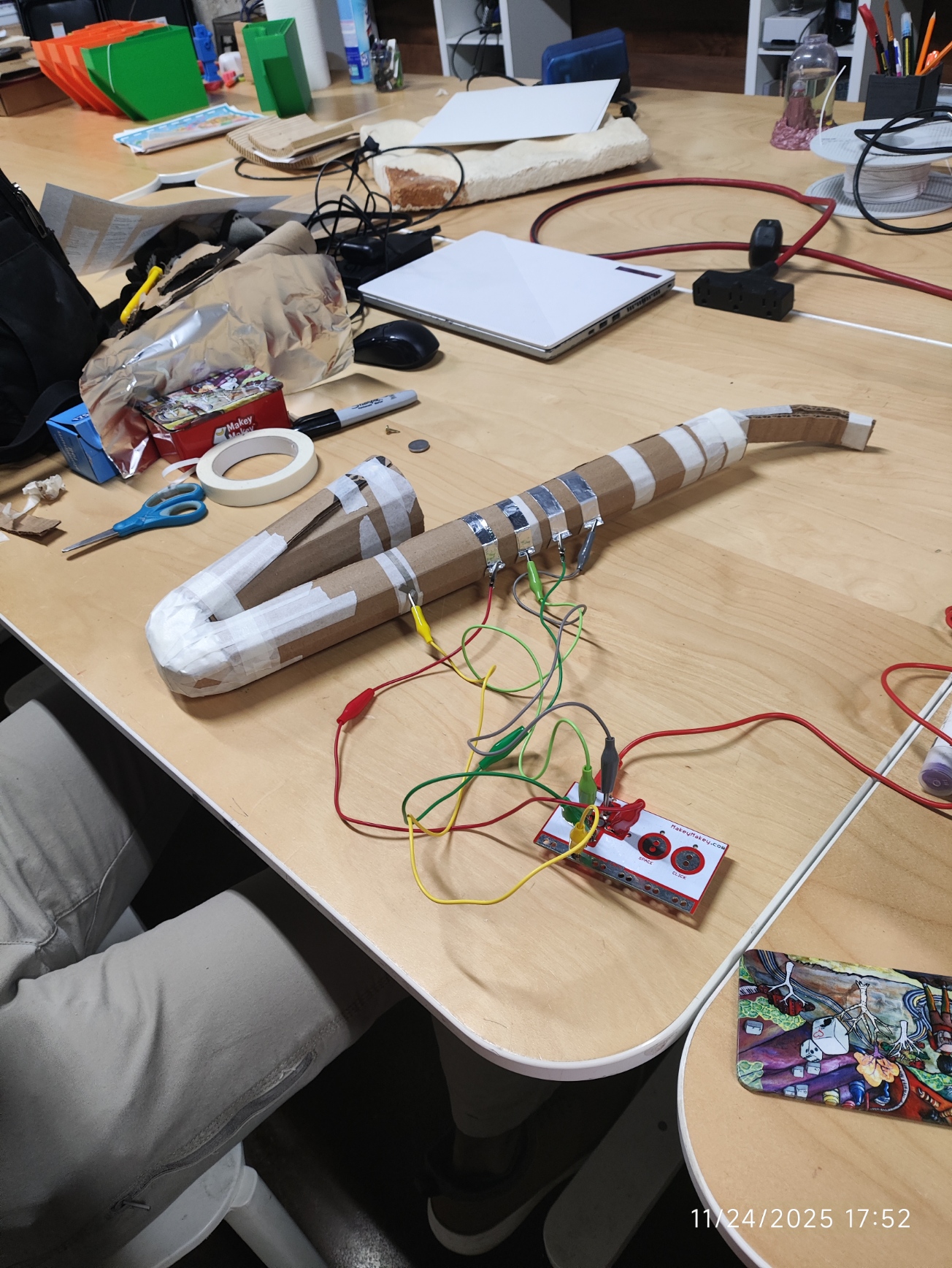 Using a Makey Makey, connect each “button” of your instrument to an input and the “earth” to the Earth in the Makey Makey. Plug in your Makey Makey into a computer with Scratch, and using Scratch plus the Music and Makey Makey extensions, add a musical note to each input.
