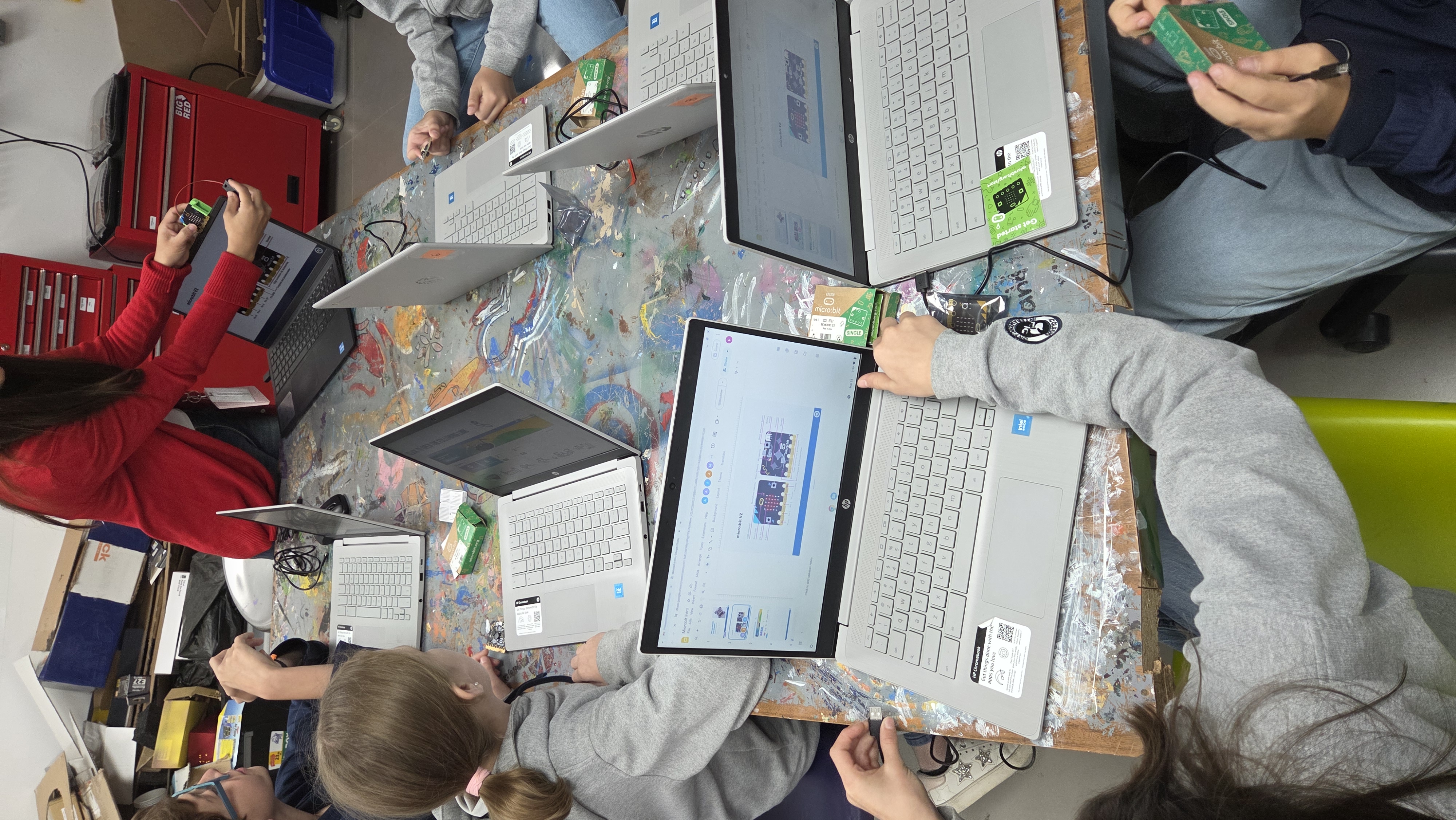 During this lesson, students design a car using the material found in the fablab. This car should be able to hold the MicroBit and its battery pack. Using their creations, they measure how steep the different ramps of the school are. If the car moves fast, the ramp is too steep, if it has less acceleration, it’s not too steep. In order to measure this, they also program the MicroBit so that it can show a different face on the lights according to the acceleration. This lesson is done with the colaboration of different subjects and teachers.