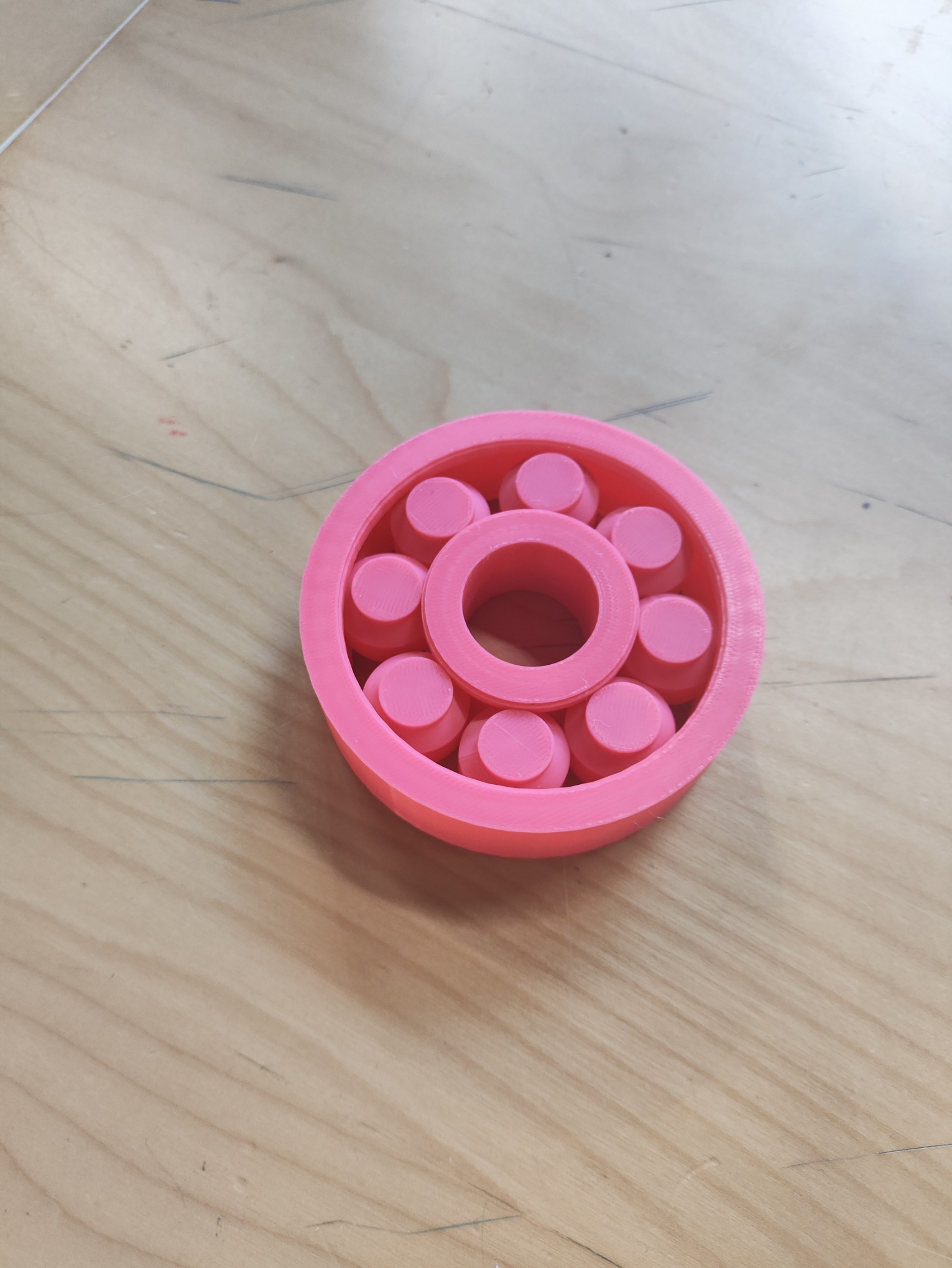 The students will try to figure out how the ball bearing works. You’ll explain that the rotation and shape of the balls reduces friction, permitting an easier, smoother rotation. It also constraints motions to one axis.