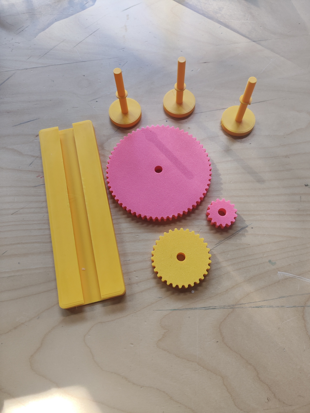 Finally they play with the gear by putting it on the gear sticks (each has a different elevation), inserting them in the base and spinning the gears. The gear is a lever with a rotational motion that when paired with other gears creates a gear train. They should discover that spinning a gear with more teeth makes the one with less teeth spin faster, and vice versa. They can also see the existence of idler gears: if you put the 30 teeth gear between the 60 teeth and 15 teeth, the speed change is the same as if connecting the 15 teeth directly to the 60 teeth. You can also explain how spinning a lower teeth gear increases the torque (the strength) the higher teeth gear produces. If you print multiple sets of gears you can also try introducing compound gear trains.