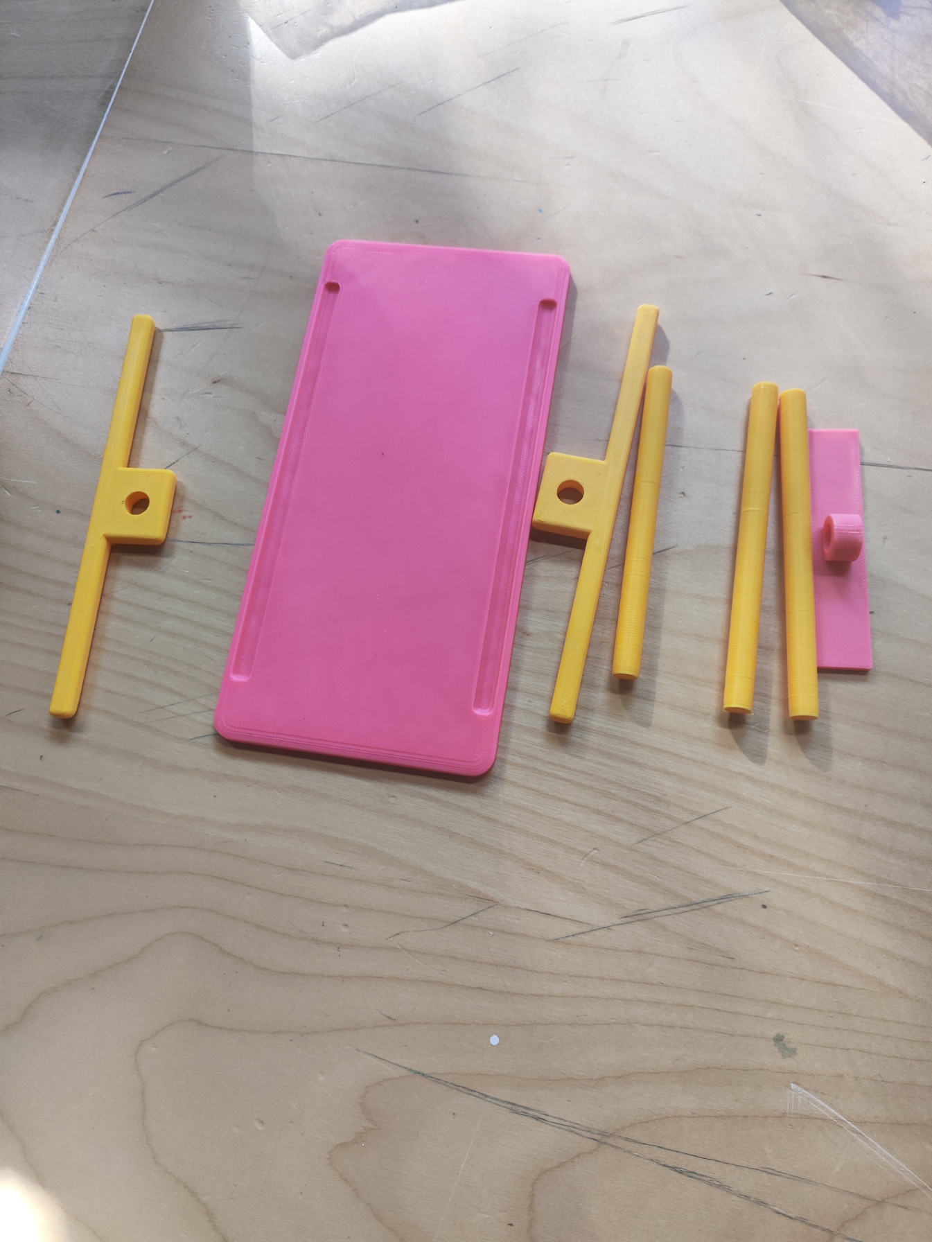 They’ll try to put together the lever, using the base, a stick, the stands and the lever plank. They can try the three different sticks, each of which has a different thickness, therefore clearance, to see how friction affects the functionality of the lever.