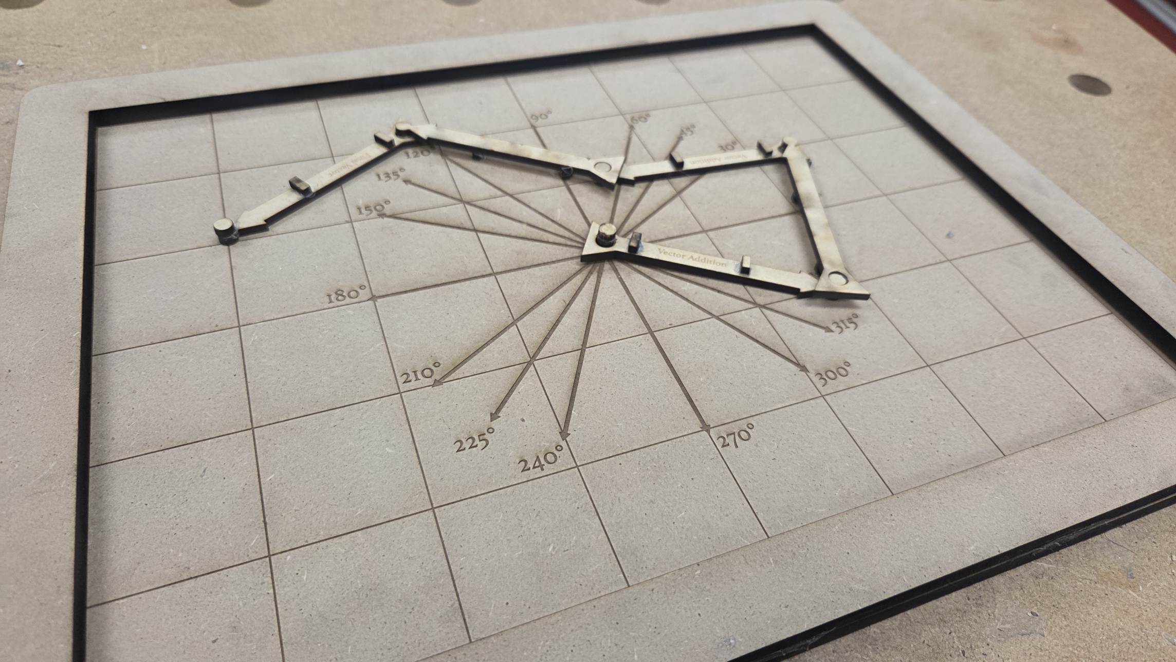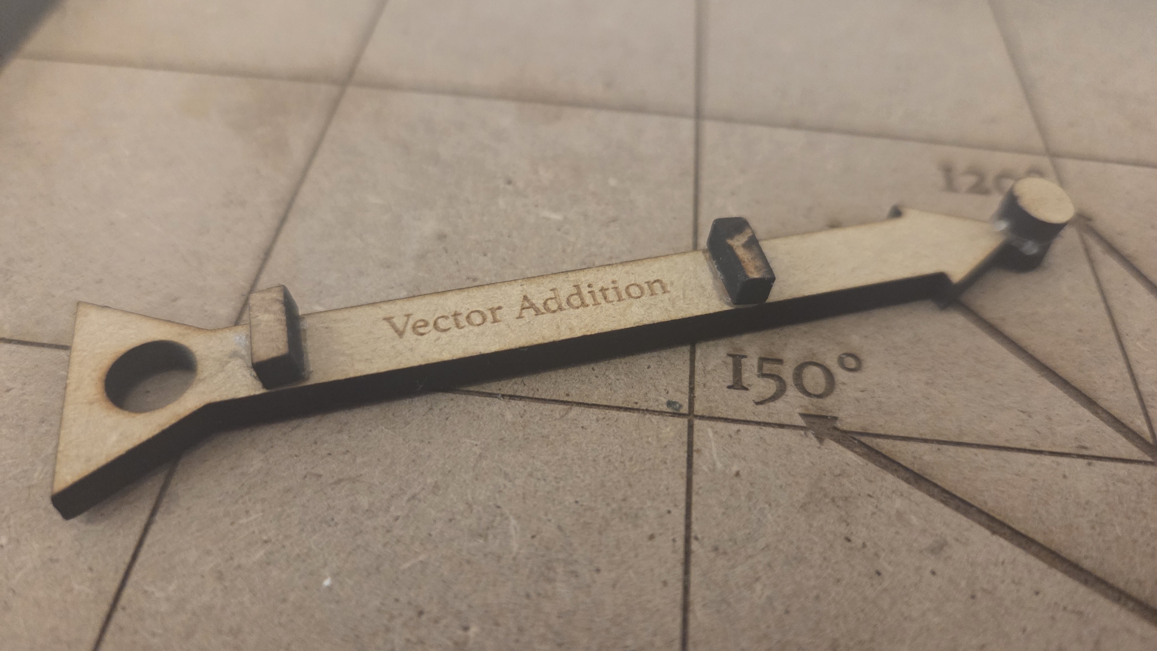 Using the attached .AI file, laser cut the board and vector pieces. All pieces can be cut together or separately, and each board should include at least two vectors. After cutting, some gluing is required to complete the peg connectors.